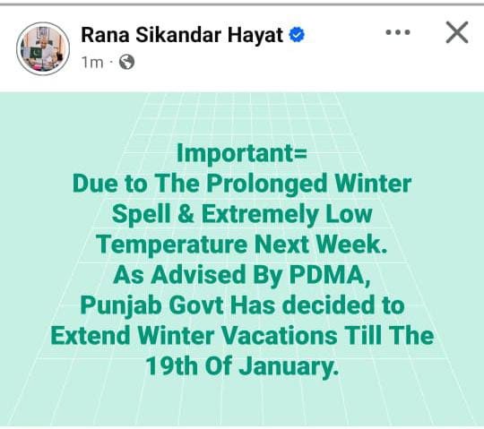 The Punjab government has officially declared an extension in winter holidays for schools and colleges throughout the province. This step has been taken to safeguard students from extreme cold and unfavorable weather conditions. The decision was made after receiving recommendations from the Provincial Disaster Management Authority (PDMA), which forecasted unusually low temperatures in several regions of Punjab.